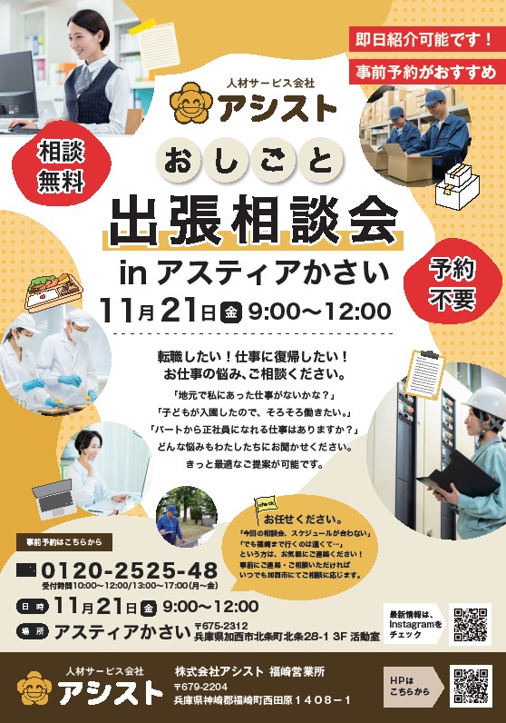 | 【備考】 | 【おしごと 出張相談会 in アスティアかさい】 11月21日(金)9:00~12:00まで 加西市のアスティアかさい 3F活動室にて おしごと出張相談会を実施します。 「地元で私にあった仕事がないかな? 「子どもが入園したので、そろそろ働きたい」 「パートから正社員になれる仕事はありますか?」 どんな悩みもわたしたちにお聞かせください。 この機会にぜひ、ご相談にお越し下さい♪ お任せください 「今回の相談会、スケジュールが合わない」 「でも福崎まで行くのは遠くて・・・」 という方は、お気軽にご連絡ください! 事前にご連絡・ご相談いただければ、 いつでも加西市にてご相談に応じます。 【応募後の流れについて】 応募内容を確認させていただき、福崎営業所(0790-22-8060)よりお電話させていただきます。 応募→就業の流れは以下の流れになります。 【1】応募(エントリー) 【2】お電話で簡単な打ち合わせ(電話) 【3】登録(無料)、お仕事の紹介 【4】面接へ向けての準備(履歴書・職務経歴書の確認など) 【5】面接 【6】勤務開始 ※ご相談から登録、就業開始まで「完全無料」なので、ご安心下さい! |