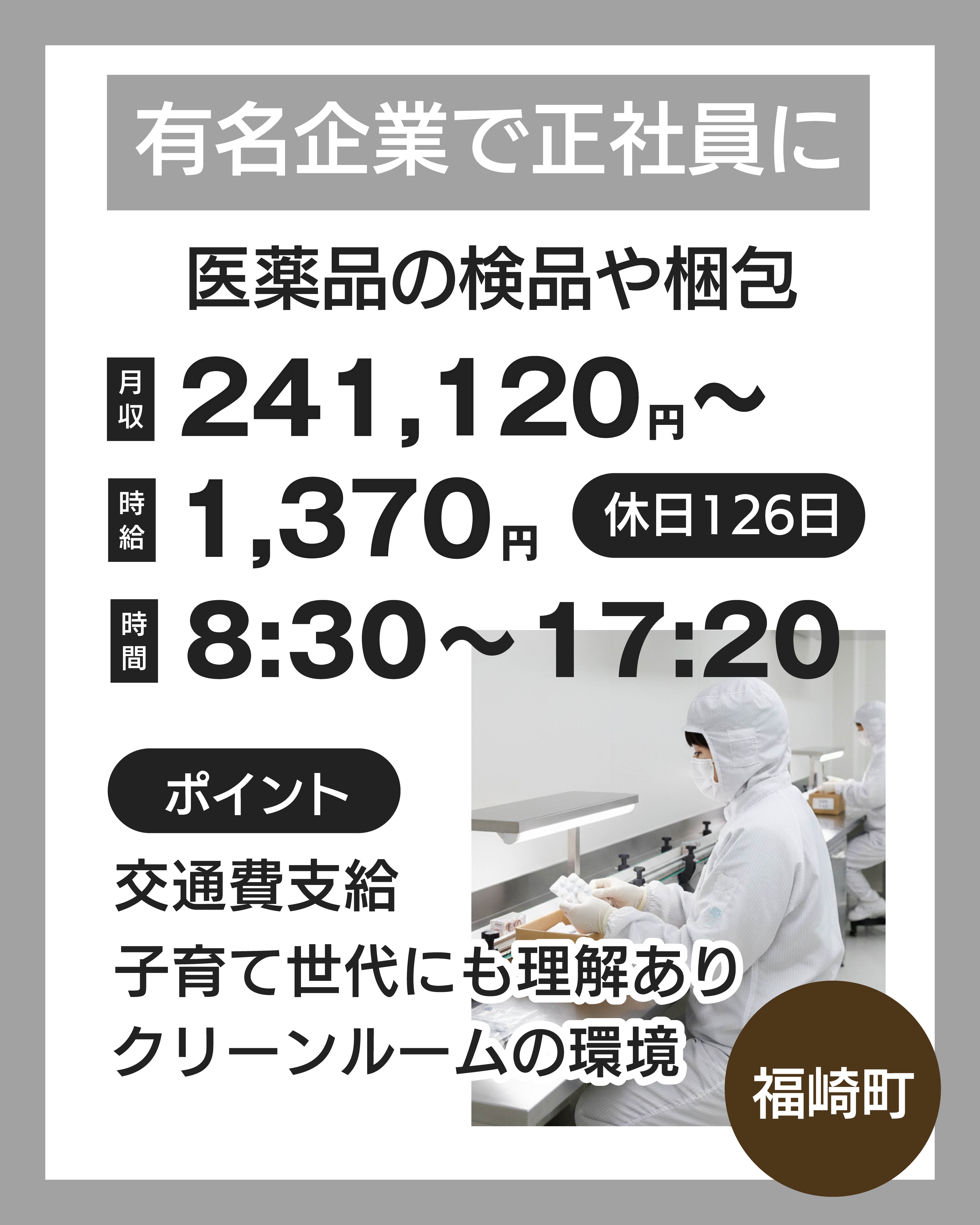 | 【仕事内容】 | 医療用商品の検査・梱包スタッフ |