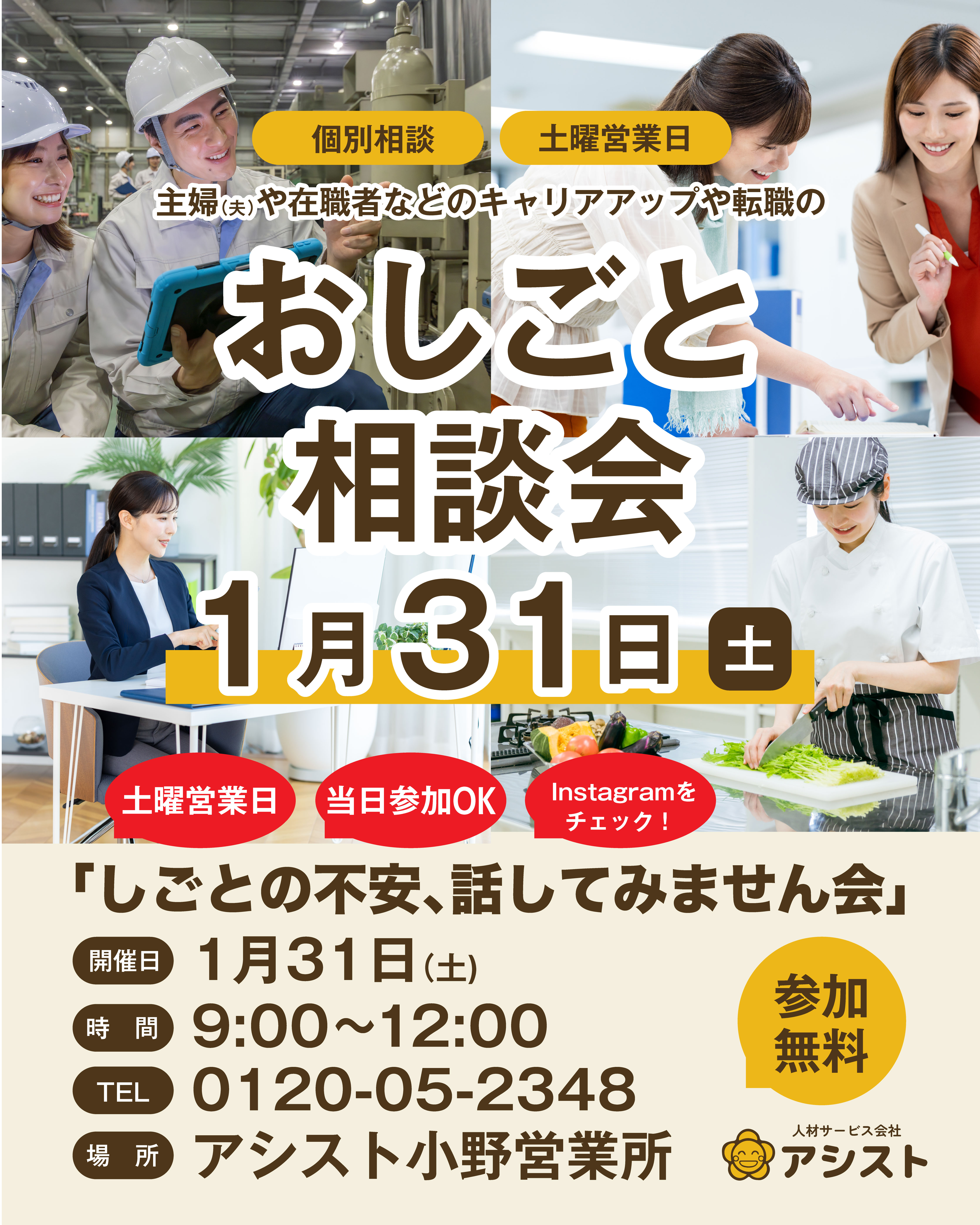 | 【備考】 | 【お仕事相談会 1月の開催予定】 日時:1/31(土)9:00~12:00 場所:アシスト小野営業所(店舗前に駐車場あり) お気軽にご相談ください!(事前予約も可) \予約不要・私服OK・匿名相談OK/ お仕事のモヤモヤ、聞かせてください。 キャリアプランナーがあなたの「これから」を一緒に考えます。 相談会であなたに合った働き方、見つけましょう! 参加無料です。お気軽にどうぞ♪ 【応募後の流れについて】 応募内容を確認させていただき、小野営業所(0794ー70ー9150)よりお電話させていただきます。 応募→就業の流れは以下の流れになります。 【1】応募(エントリー) 【2】お電話で簡単な打ち合わせ(電話) 【3】登録(無料)、お仕事の紹介 【4】職場見学 【5】契約、就業開始 ※ご相談から登録、就業開始まで「完全無料」なので、ご安心下さい! |